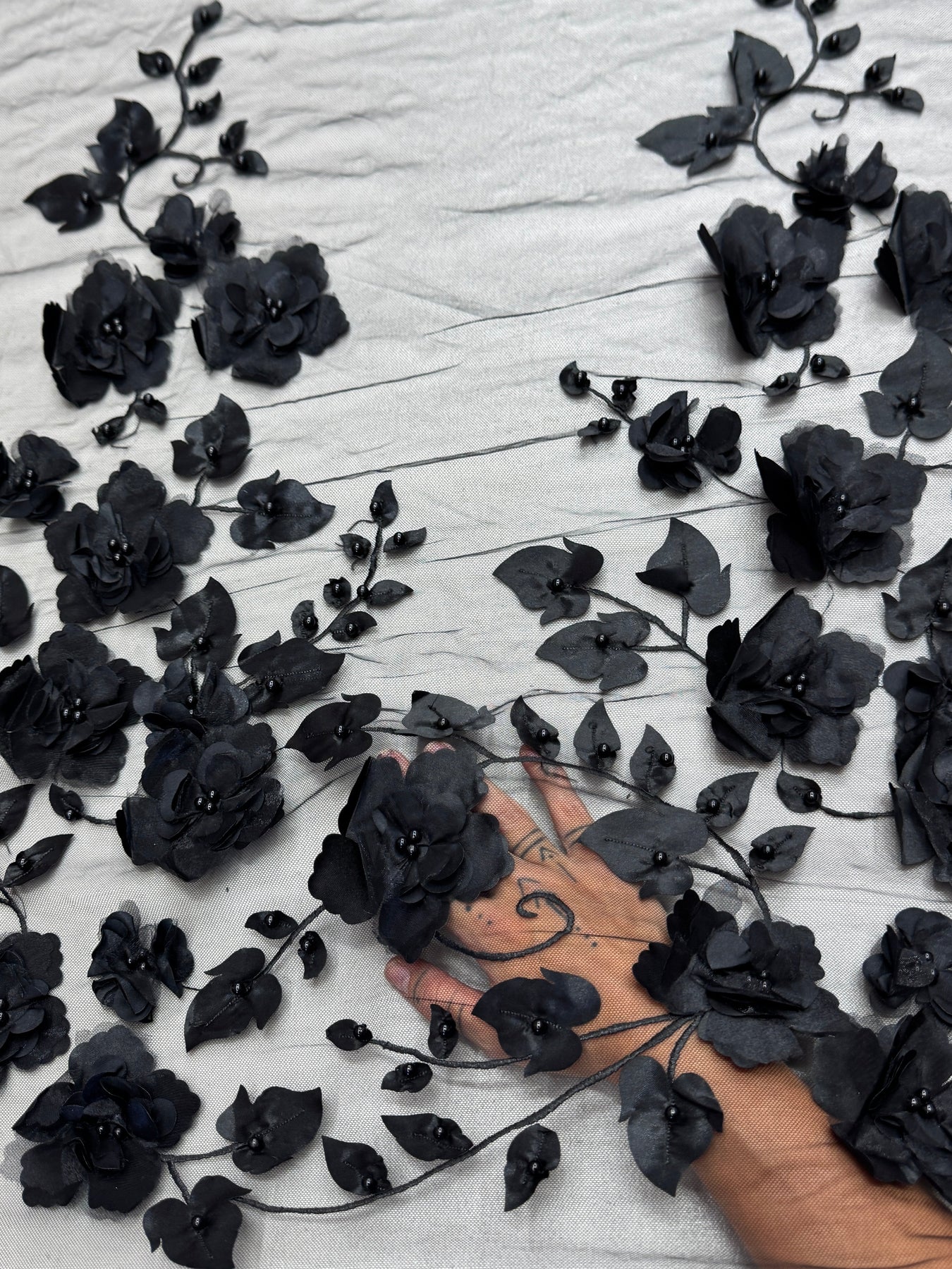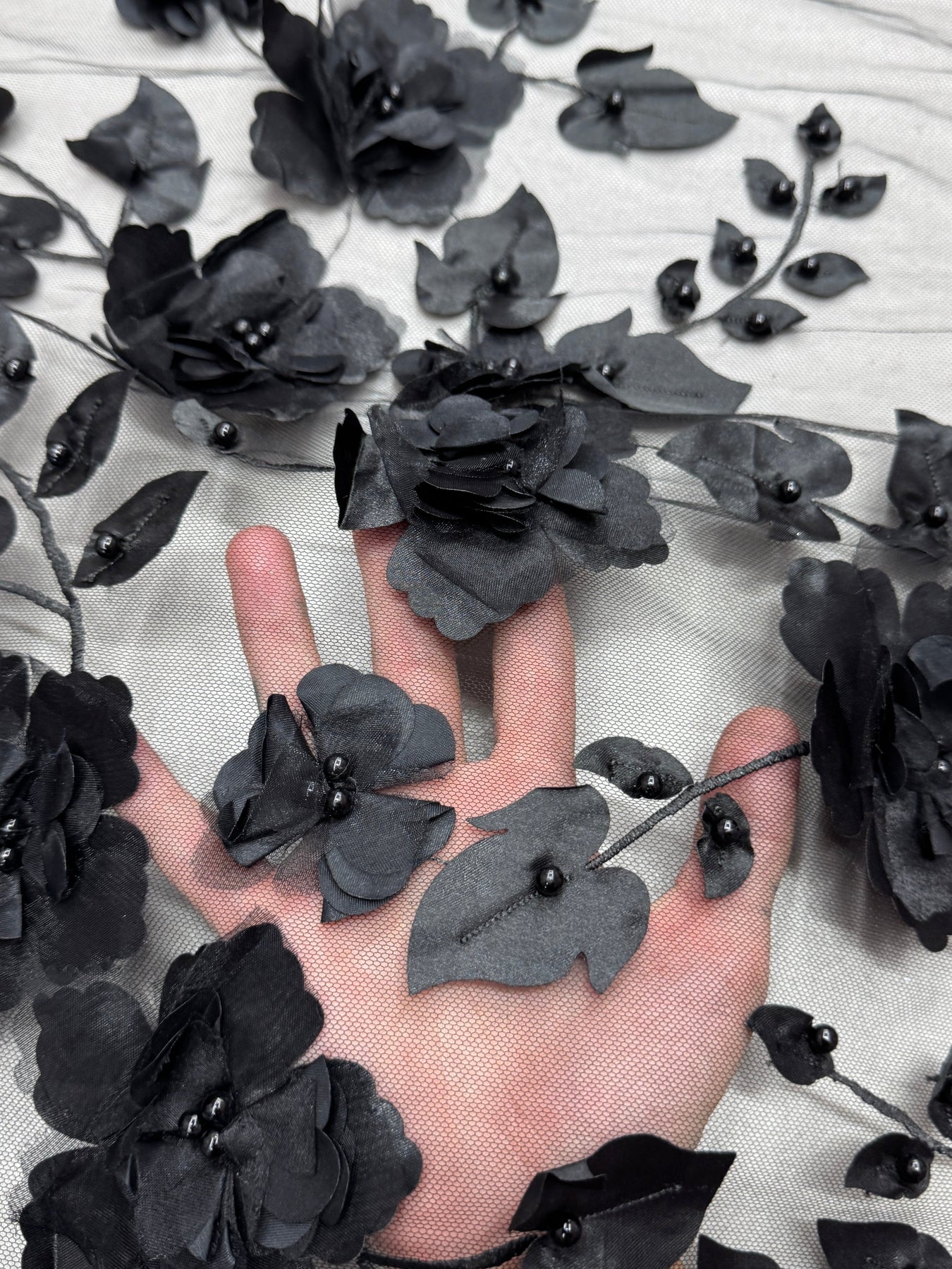 "This lace has a bold look, and the black color makes the 3D flowers stand out nicely. I liked how secure the beads felt while working with it." Lauren J., Verified Kikitextiles Customer ✅