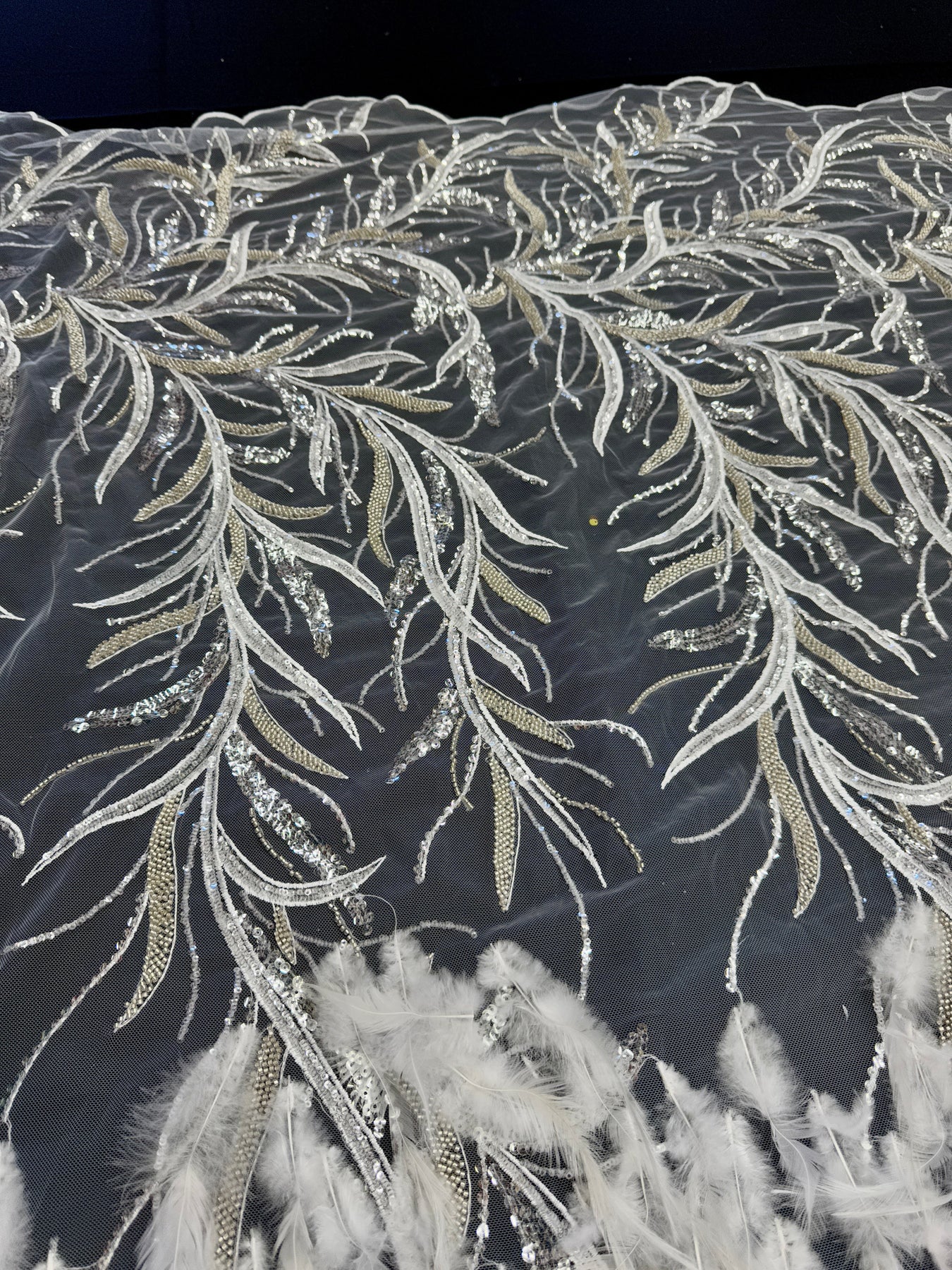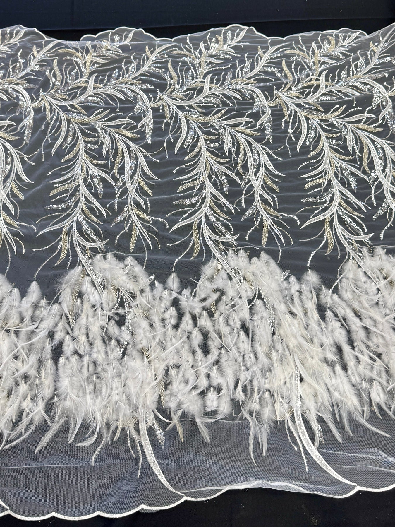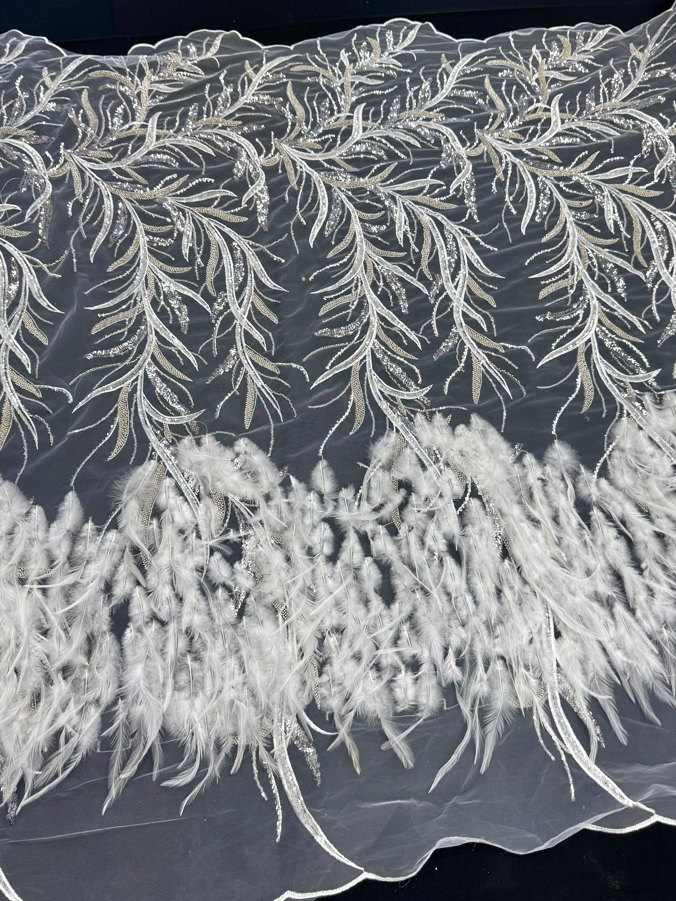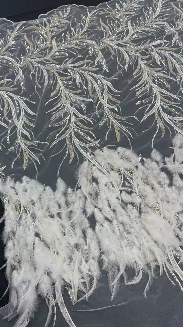 This luxurious feather embroidered lace is designed to make an unforgettable statement. Delicate branch-inspired motifs are intricately embroidered with beads and sequins, creating movement, texture, and depth across a sheer tulle base.