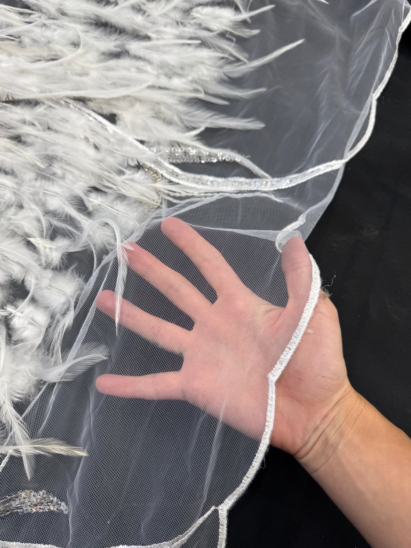 The transparent mesh allows the embroidery and feathers to stand out while kee