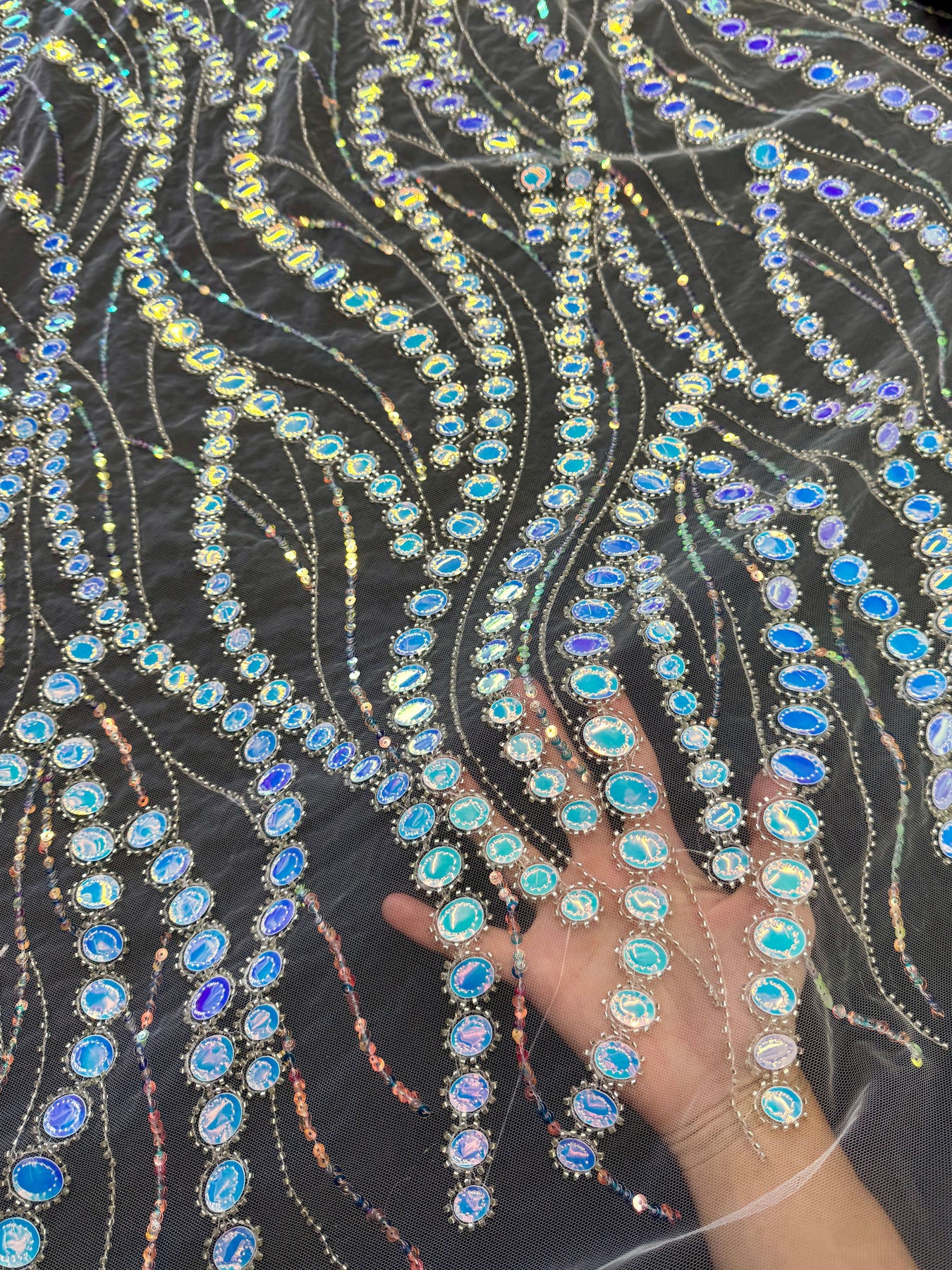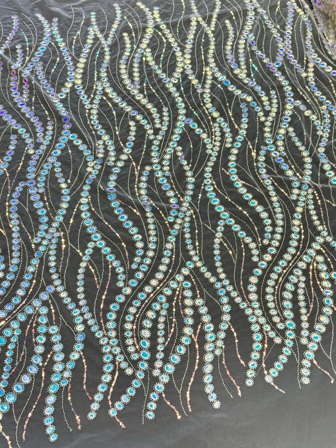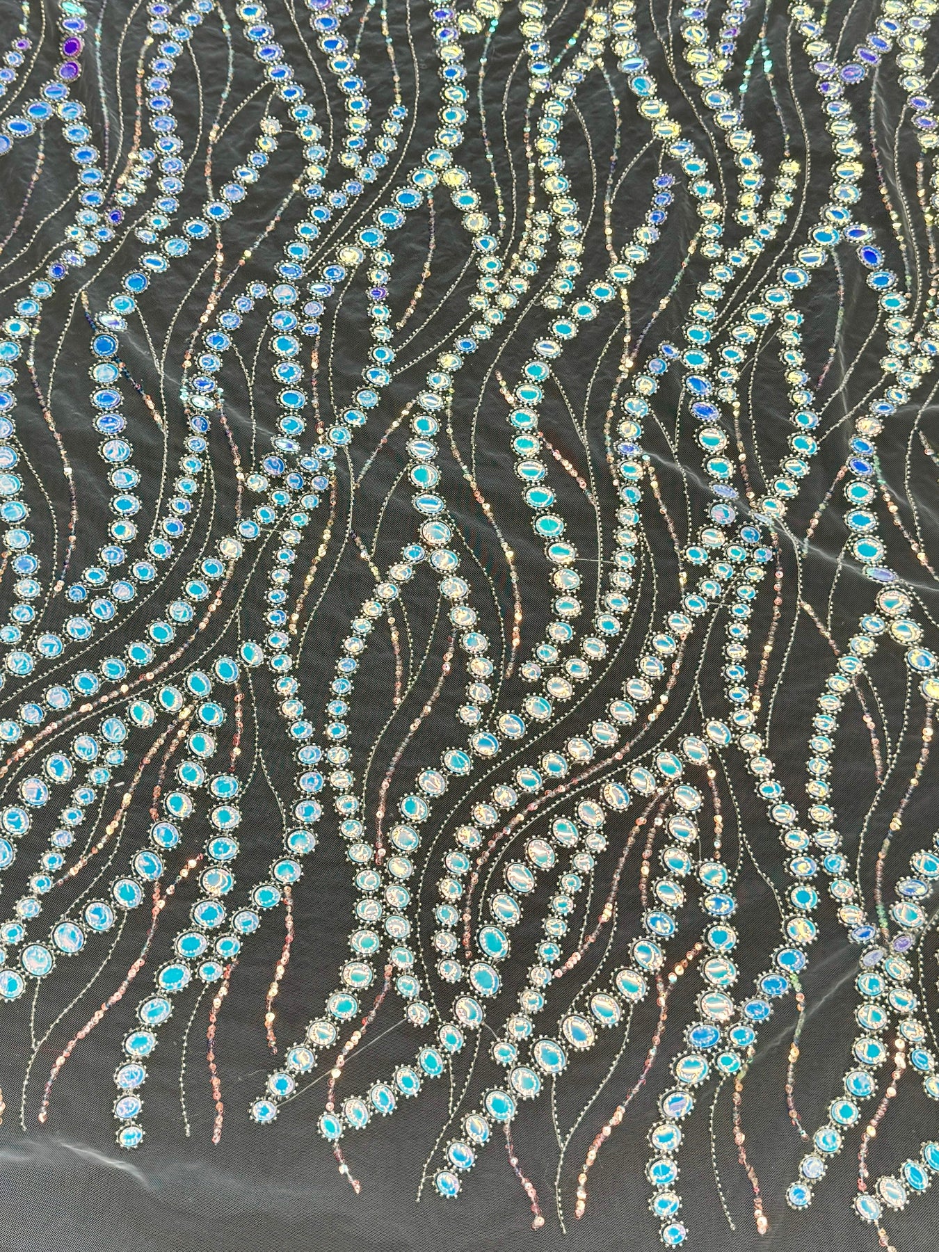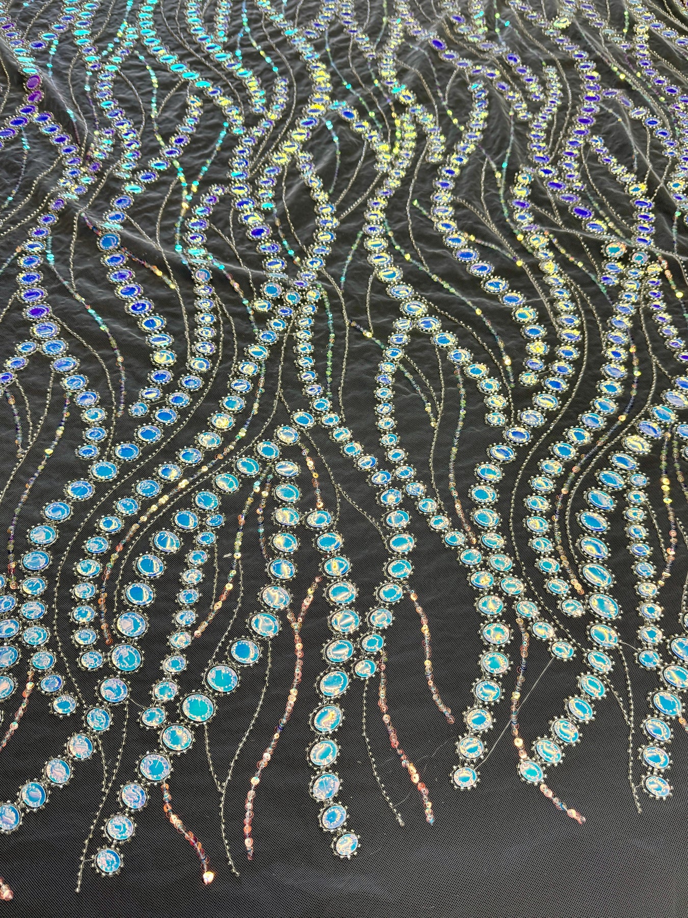 This Midnight Mirror Sequin Wave Lace features a striking wave pattern made from reflective mirror-style sequins and fine bead lines, arranged in fluid, vertical movement across a sheer stretch mesh base. The design feels modern and bold, with a high-fashion look that stands out without being bulky or stiff.