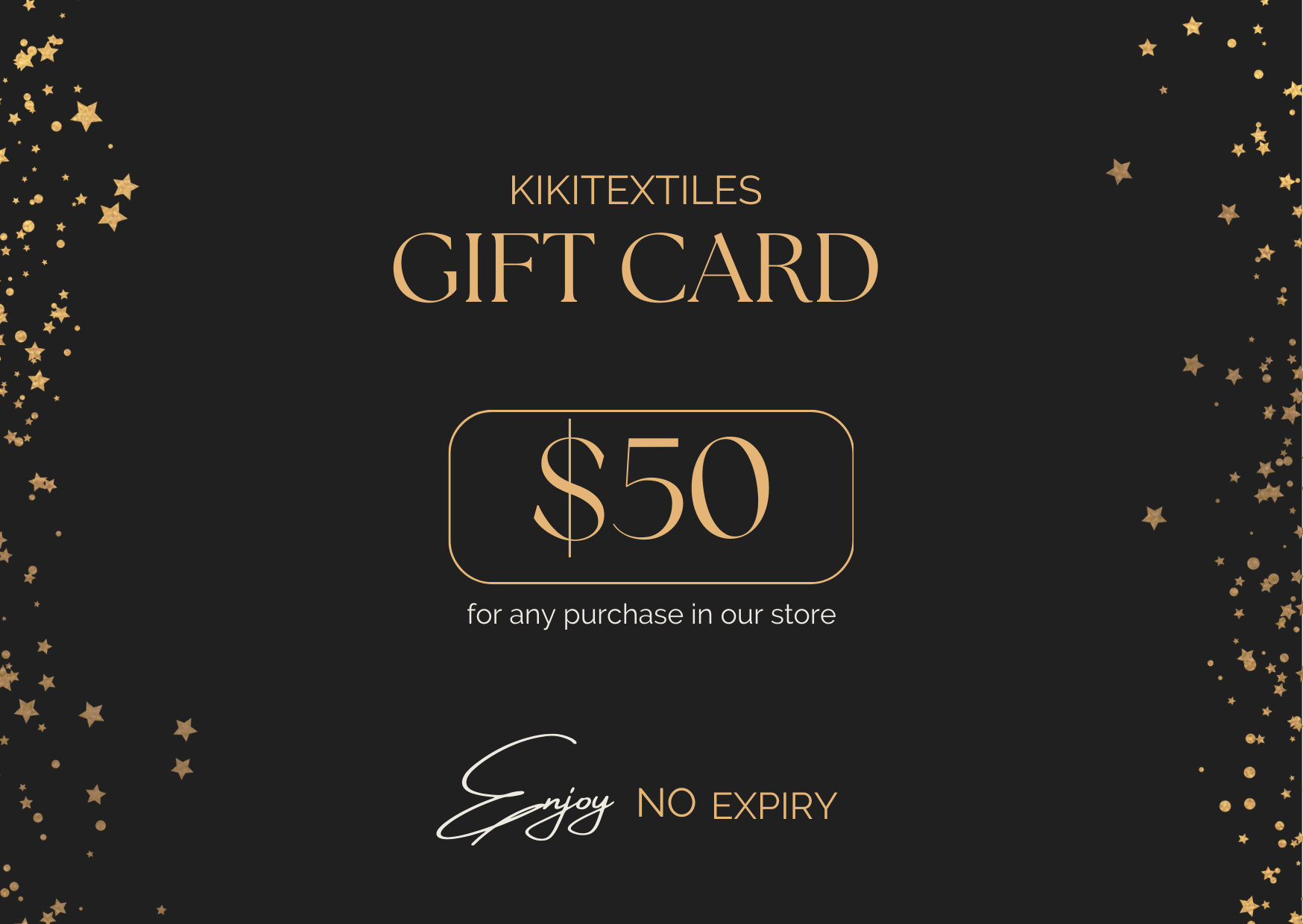 Introducing the KIKITEXTILES Gift Card – the ideal treat for fabric lovers! Give the gift of choice and let them pick their favorite fabrics from our awesome collection. Whether it's soft cottons or vibrant silks, our store has it all. With the KIKITEXTILES Gift Card, you're giving the joy of creating something special. Perfect for any occasion, because at KIKITEXTILES, we believe in making every project a masterpiece!